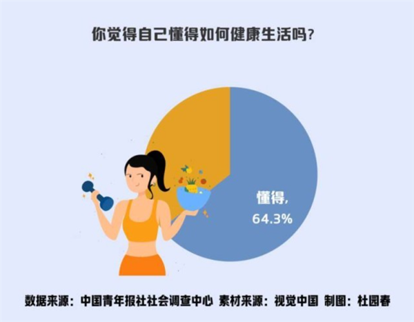 調(diào)查顯示,64.3%的受訪青年認為自己懂健康生活,35.7%的受訪青年表示“不懂”。進一步分析顯示,受訪青年所在城市級別越高,認為自己懂健康生活的比例越高,一線城市受訪青年的比例最高,為71.6%;上班族認為自己懂健康生活的比例(65.8%)略高于在校大學(xué)生(64.6%);隨著年齡的增長,受訪青年認為自己懂健康生活的比例越高,受訪85后最高,為67.2%,00后相對最低,為61.2%。