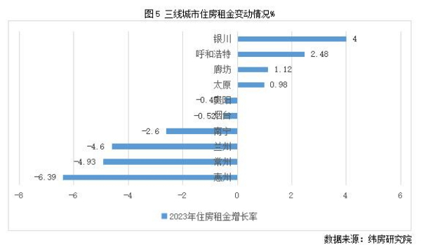 三線(xiàn)城市住房租金漲跌接近參半。住房大數(shù)據(jù)監(jiān)測(cè)的重點(diǎn)40城中包括10個(gè)三線(xiàn)城市,其中4個(gè)城市2023年住房租金小幅上漲,6個(gè)城市下降。其中,銀川和呼和浩特漲幅最高,分別為4%和2.48%;惠州、常州和蘭州住房租金跌幅較高,分別為6.39%、4.93%和4.6%。