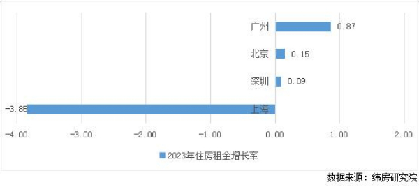 多數(shù)一線(xiàn)城市住房租金微漲,個(gè)別租金下跌。一線(xiàn)城市中,廣州、北京和深圳2023年住房租金分別上漲0.87%、0.15%和0.09%。上海住房租金下跌3.85%。