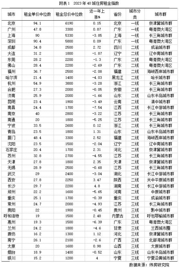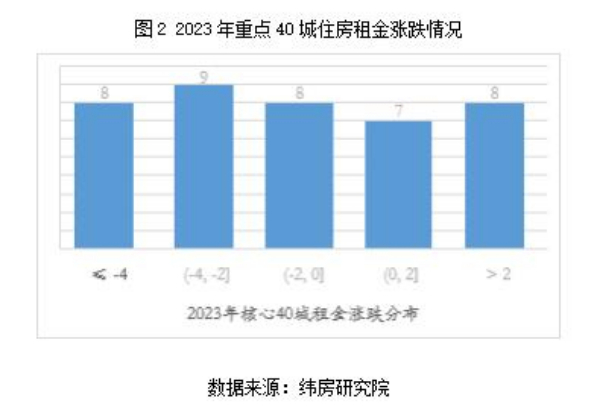 從漲跌結(jié)構(gòu)看,緯房研究院數(shù)據(jù)顯示,2023年重點(diǎn)40城中有15個(gè)城市住房租金同比上漲,其余25個(gè)城市住房租金同比下降。住房租金上漲的城市中,7個(gè)城市漲幅在2%以?xún)?nèi),8個(gè)城市漲幅超過(guò)2%;住房租金下跌的城市中,8個(gè)城市跌幅在2%以?xún)?nèi),9個(gè)城市跌幅在2-4%;8個(gè)城市跌幅超過(guò)4%。