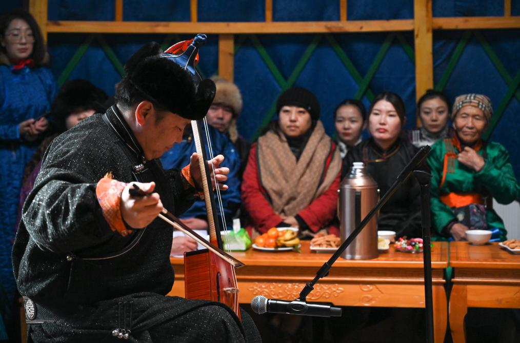 2023年12月21日,烏蘭牧騎隊(duì)員在阿其圖烏拉蘇木進(jìn)行馬頭琴演奏表演。新華社記者 王楷焱 攝