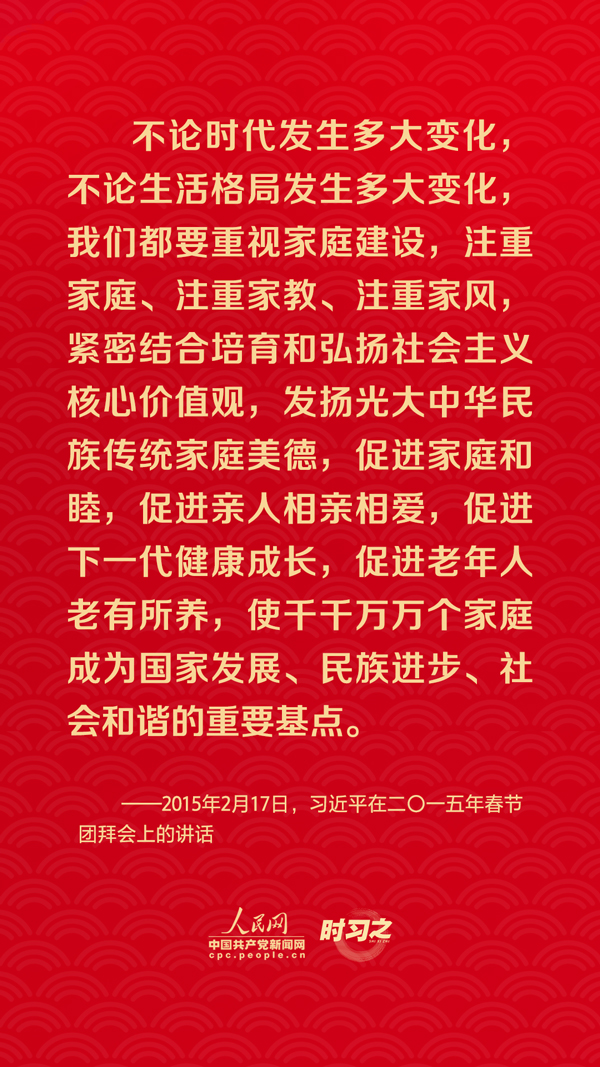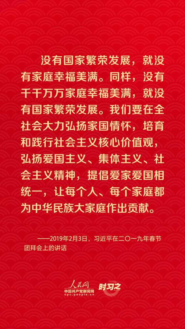 團(tuán)圓是春節(jié)永恒的主題。“沒(méi)有國(guó)家繁榮發(fā)展,就沒(méi)有家庭幸福美滿。同樣,沒(méi)有千千萬(wàn)萬(wàn)家庭幸福美滿,就沒(méi)有國(guó)家繁榮發(fā)展。”習(xí)近平總書(shū)記曾在多個(gè)場(chǎng)合深刻闡述家庭與國(guó)家之間的關(guān)系,從他的話語(yǔ)里一起感悟深厚的家國(guó)情懷。