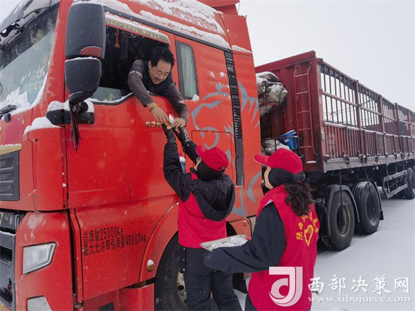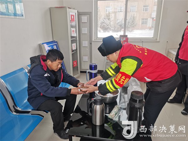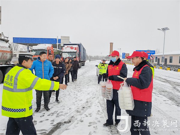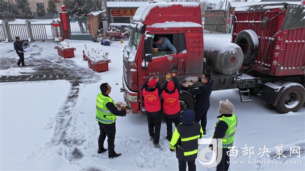 這有小米粥、炸油餅,雞蛋還熱乎著……”榆靖分公司志愿者暖心地喊著話。“行動是最好的破冰劑”,志愿者們?yōu)楦咚贉袈每退腿ナ澄?,頂風(fēng)冒雪分發(fā)給滯留在收費(fèi)站的司乘人員。一件件穿梭在寒風(fēng)中的“紅馬甲”此刻成為了冬日里最美的“志愿紅”,讓群眾在寒意逼人的天氣里感受到了一份特別的溫暖。大家紛紛表示感謝,“熱粥、小菜、松軟的饅頭下肚,全身都熱乎了。”一名滯留司機(jī)真誠地感激道。