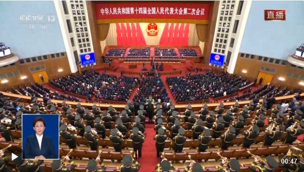 3月5日上午9時(shí),十四屆全國(guó)人大二次會(huì)議在人民大會(huì)堂開(kāi)幕,全體起立,高唱中華人民共和國(guó)國(guó)歌。