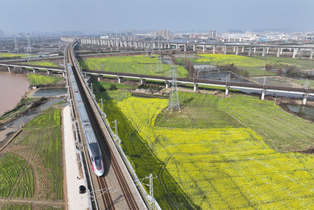 2024年3月2日,一輛高鐵列車從江西省南昌市南昌縣一處油菜花田旁駛過(無人機(jī)照片)。新華社記者 金良快 攝