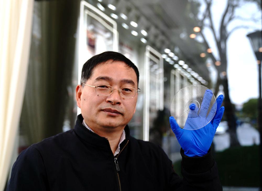 △2024年2月21日,上海光機(jī)所阮昊研究員展示“超級(jí)光盤”。