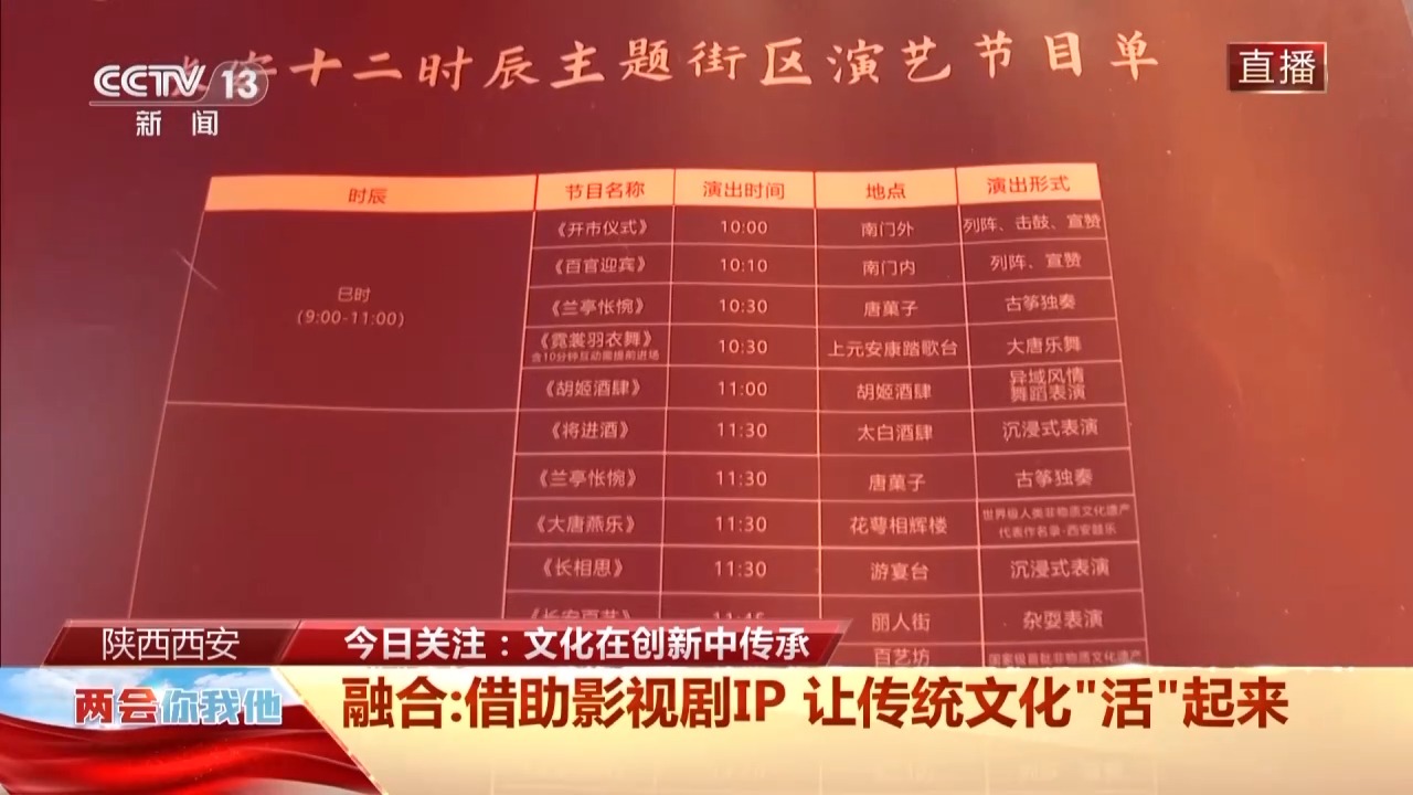 除了道具,這樣的一個主題街區(qū),小型互動表演遍布,這個節(jié)目單從早上10時的開市儀式一直到晚上10時的互動演繹,全天有70多場演出,旺季最多的時候有上百場演出。很多都是互動式的表演,比如太白酒肆里,李白的《將進酒》一出,總會出現(xiàn)現(xiàn)場齊誦的熱烈場面。這個春天,五湖四海游客齊誦唐詩的場景,已經(jīng)成為西安的一道新風(fēng)景。