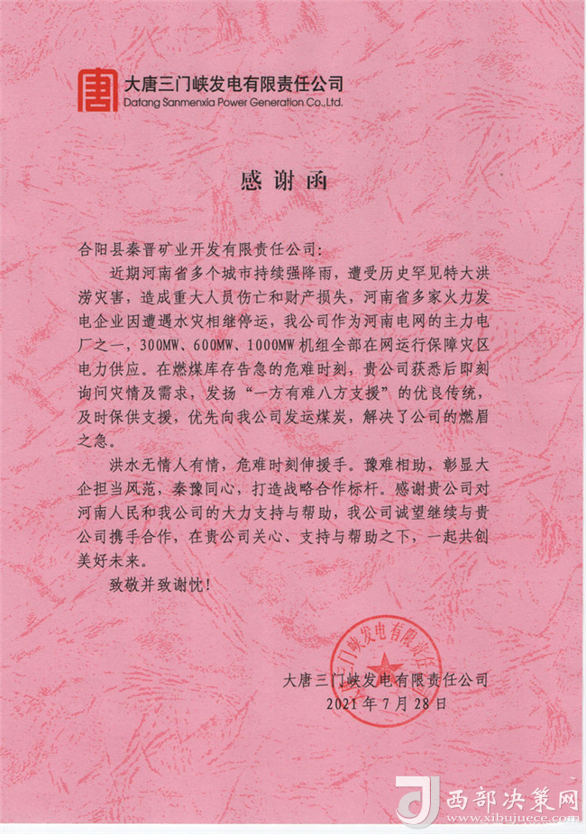 近日,大唐三門(mén)峽發(fā)電有限公司為秦晉集團(tuán)公司送來(lái)了感謝函,并將一面寫(xiě)有“豫難相助,彰顯大企擔(dān)當(dāng)風(fēng)范,秦豫同心,打造戰(zhàn)略合作標(biāo)桿”的錦旗送到了秦晉集團(tuán)公司,對(duì)秦晉集團(tuán)“一方有難八方支援”的大愛(ài)精神表示感謝?。▓D/文:聶曉英)